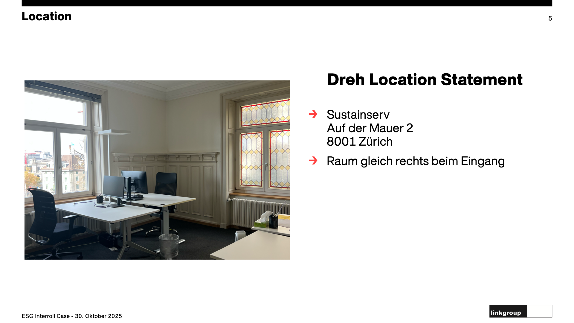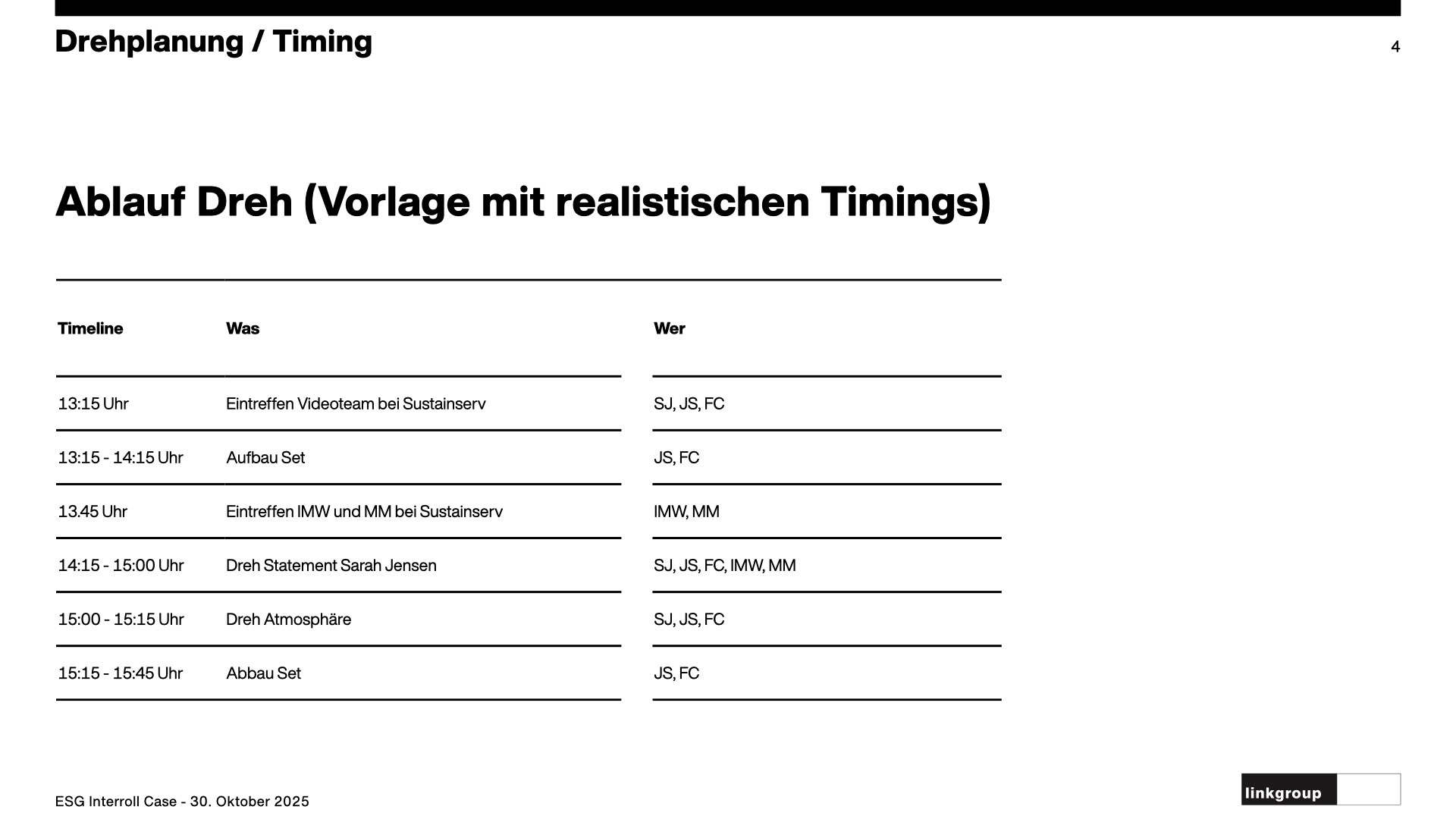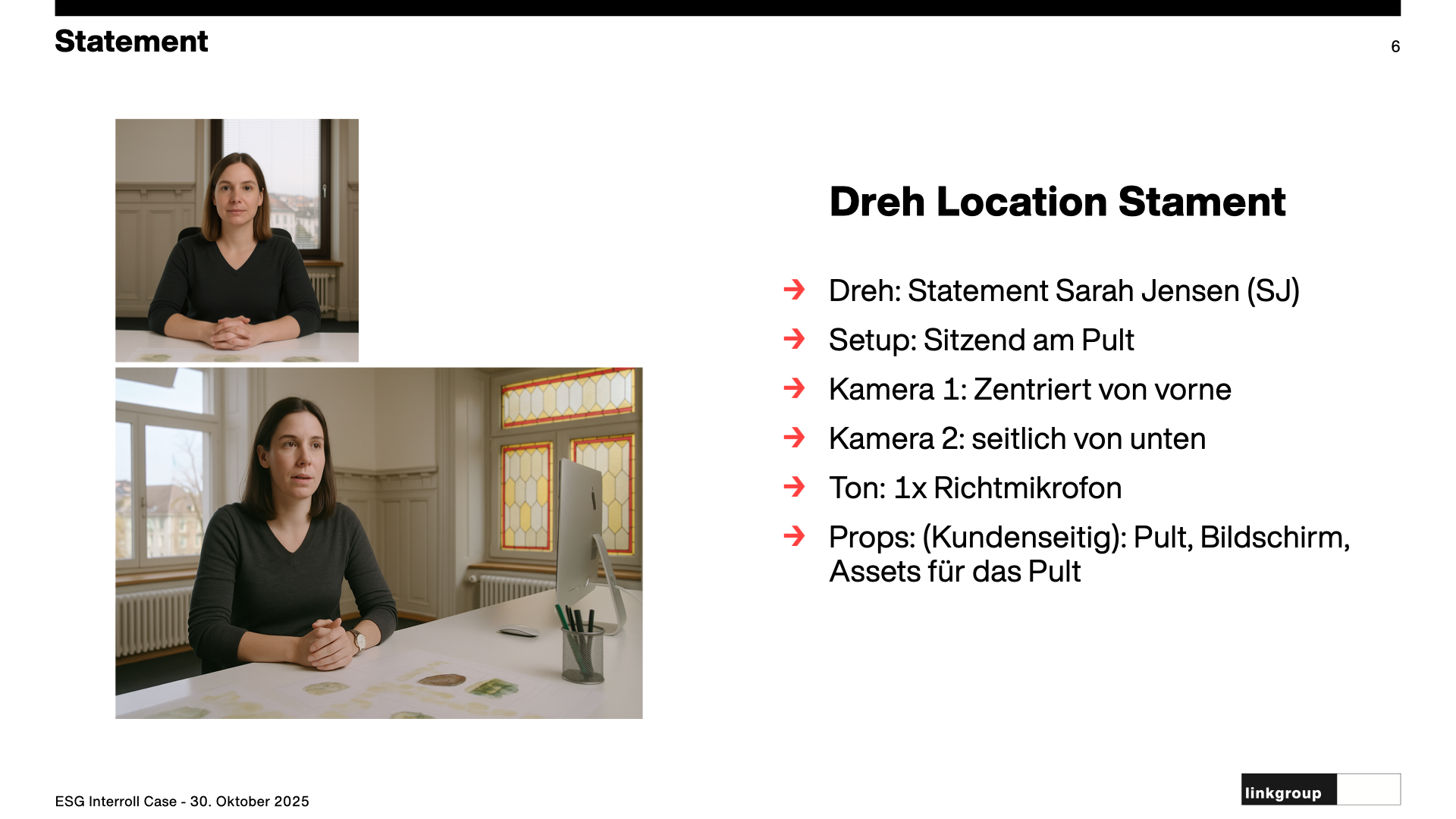 Der Fokus lag auf der technischen Umsetzung. In der Preproduction übernahm ich das Locationscouting und traf zentrale Entscheidungen zur Bildgestaltung: Position der Interviewperson, Bildkomposition, Hintergrund sowie sichtbare Details im Raum. Die B-Roll wurde inhaltlich auf das Interview abgestimmt und bereits vor dem Dreh konzipiert.