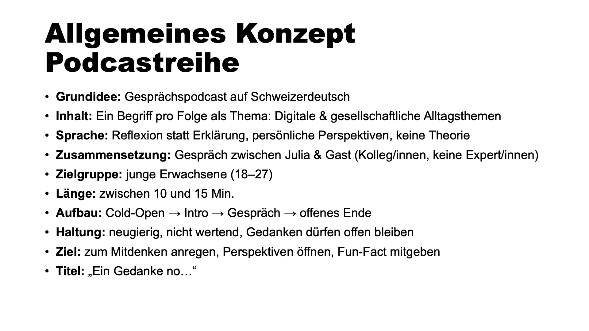 Die konzeptionelle Vorbereitung bestand aus Brainstorming, Gesprächen mit Personen aus meinem Umfeld sowie Recherche zum Thema. Daraus entwickelte ich ein offenes Ablaufkonzept mit Leitfragen, das Raum für spontane Gedanken lässt. Mir war wichtig, dass der Podcast nicht nur unterhält, sondern auch neues Wissen mitgibt. Deshalb suchte ich gezielt nach einem thematisch passenden Fakt, der während des Gesprächs eingebaut wird und eine zusätzliche Ebene eröffnet. Die Gesprächspartnerin wurde so gewählt, dass ein offener, reflektierter Austausch möglich ist und sich Gedanken im Gespräch organisch entwickeln können.
