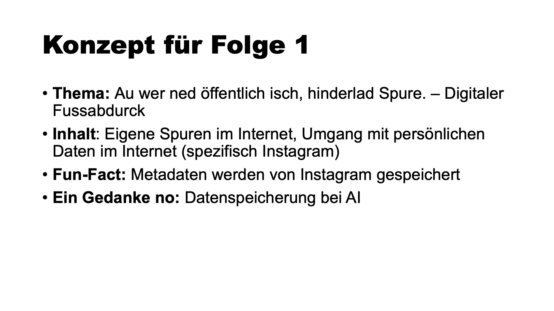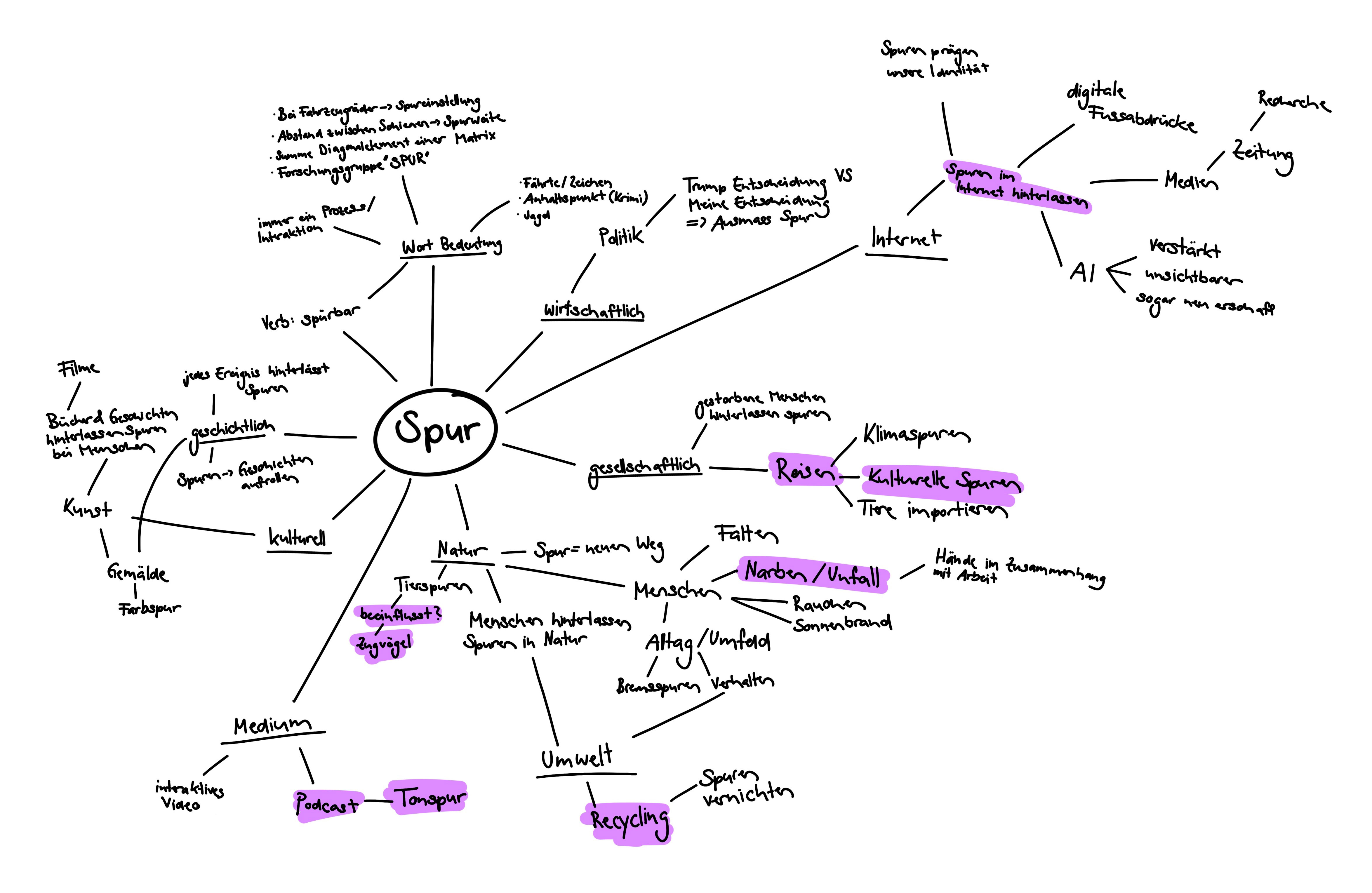Der Podcast ist als Audioformat konzipiert, da sich der Begriff Spur auch mit der Tonspur verbinden lässt. Gespräche, Pausen und spontane Reaktionen bleiben hörbar und werden nicht geglättet. Schweizerdeutsch und eine offene Gesprächsform unterstützen Authentizität und Nähe, ohne erklärend zu wirken. Ziel war es, dass sich die Zuhörerinnen und Zuhörer mit den Themen identifizieren können und das Gespräch natürlich und unverstellt bleibt.